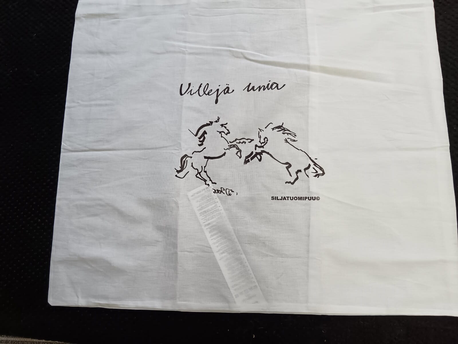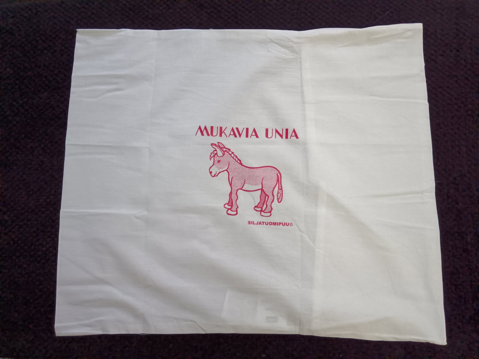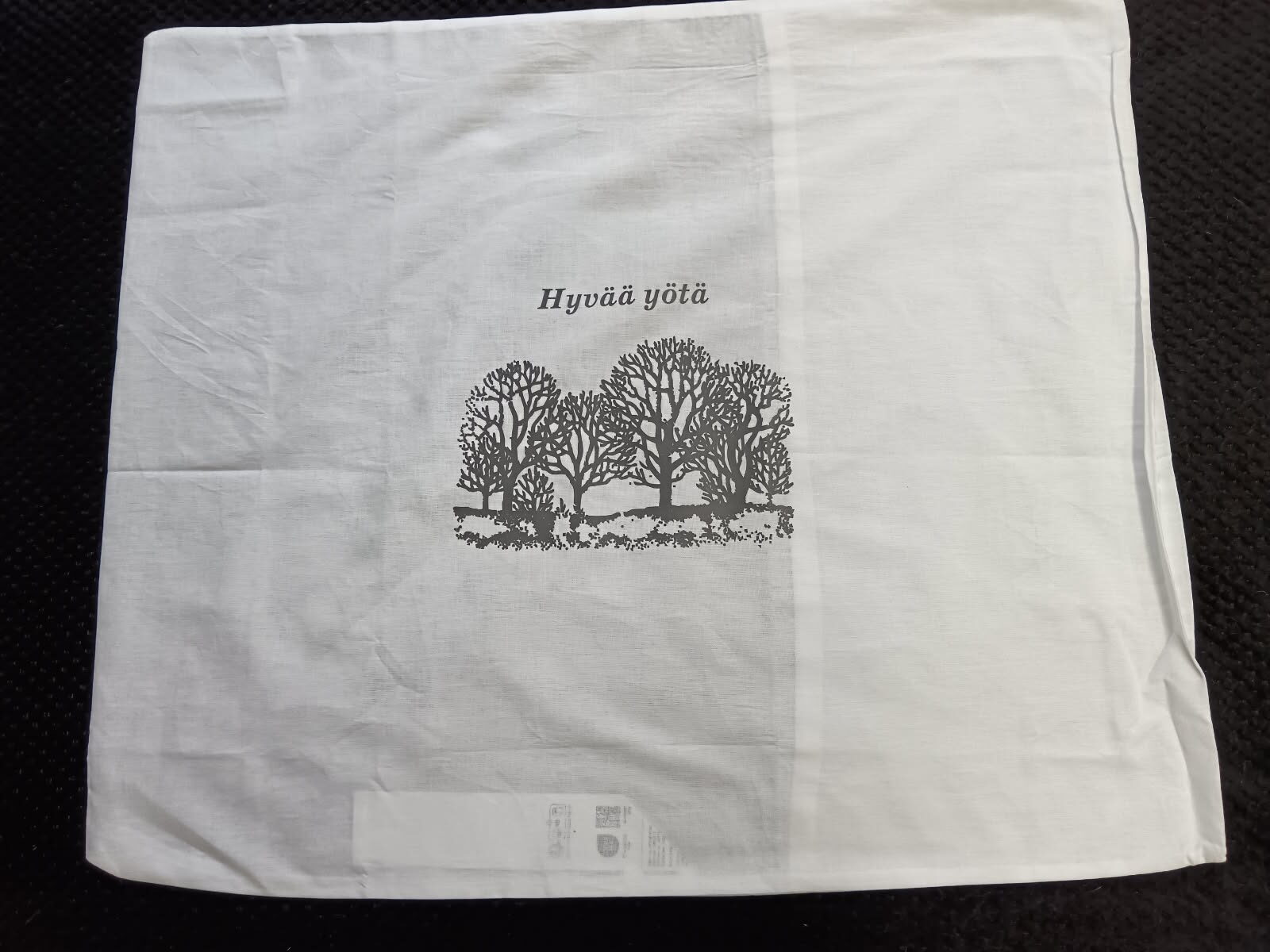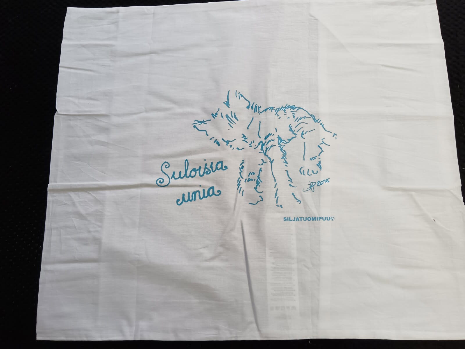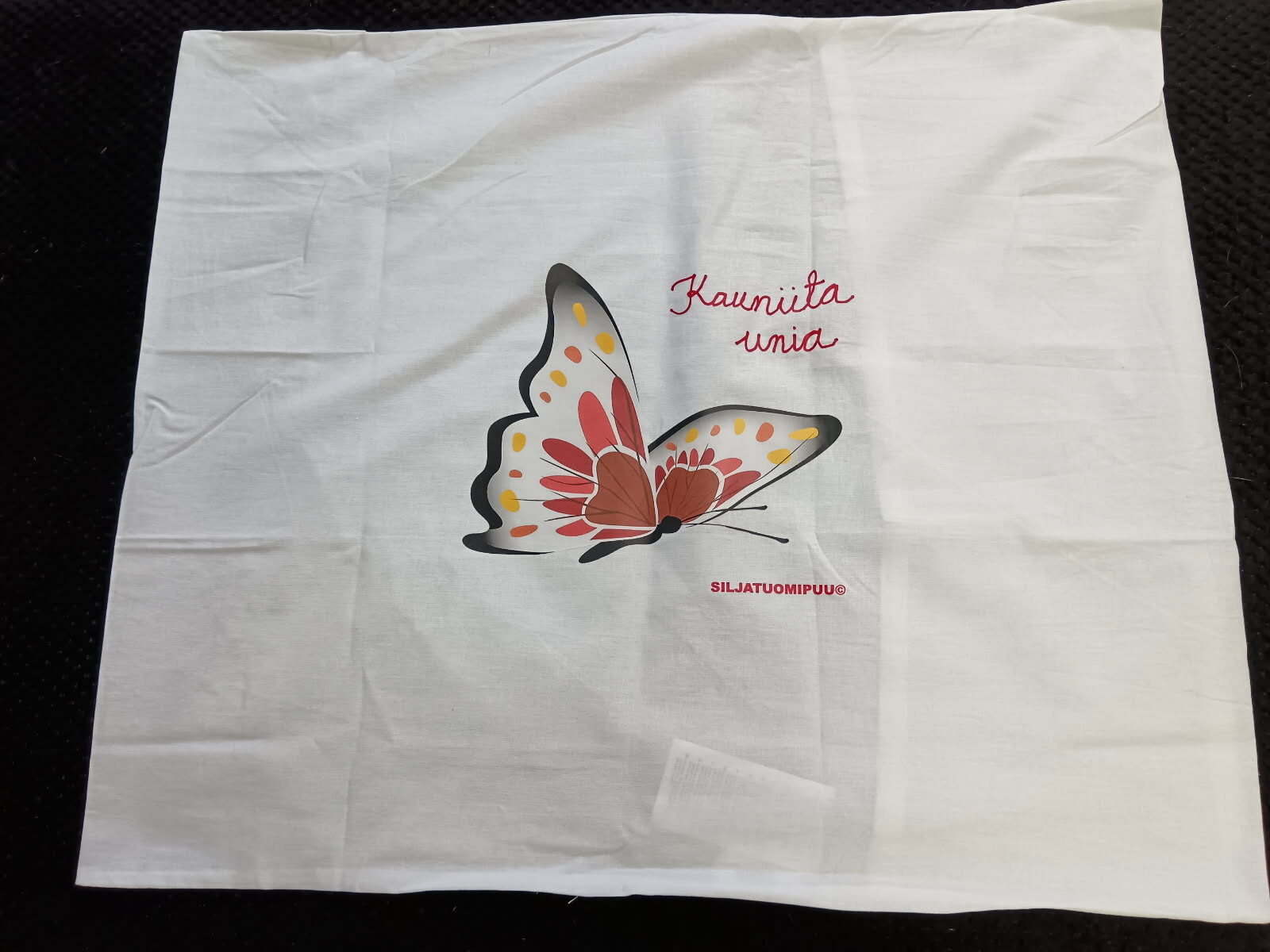 Valkoinen, puuvilla, koko 50×60 cm. Kuvioiden värit vaihtelevat.